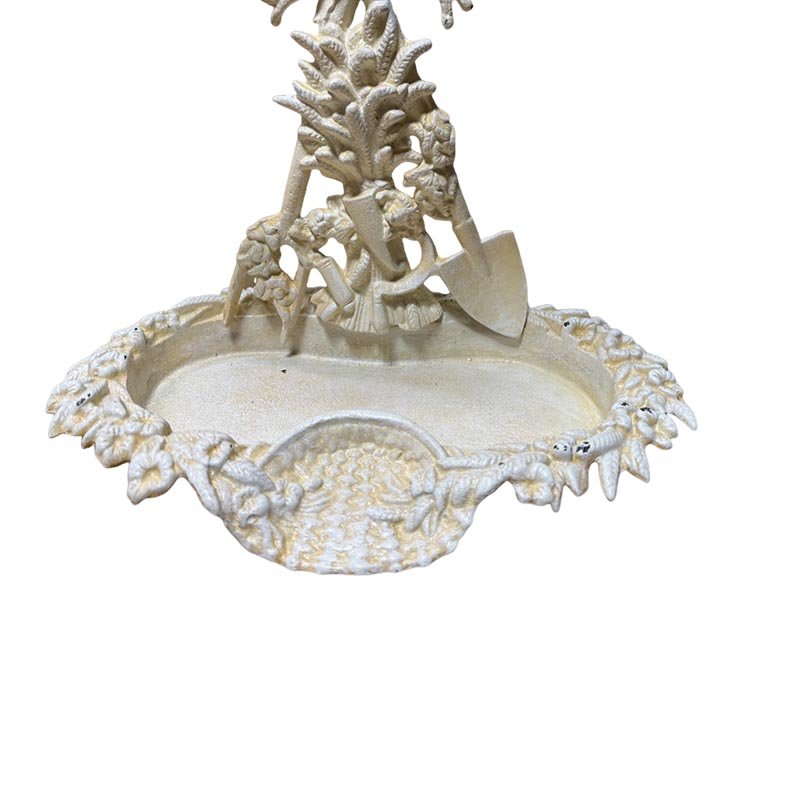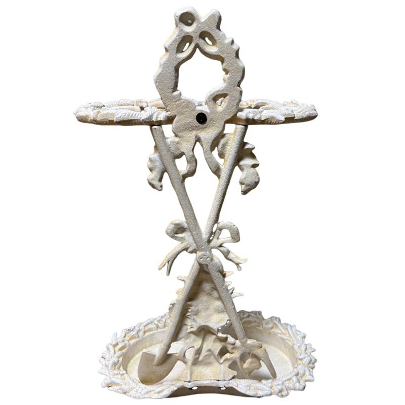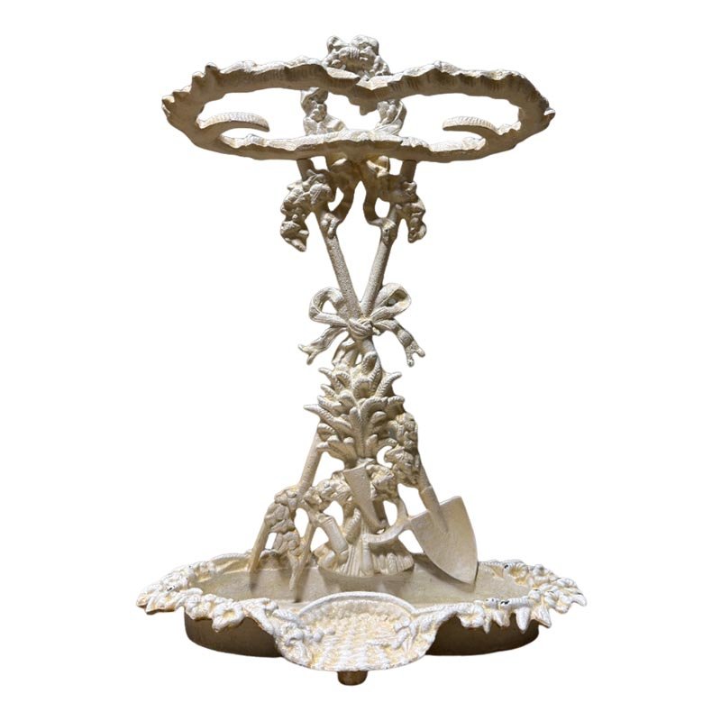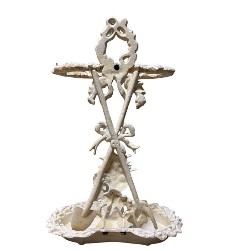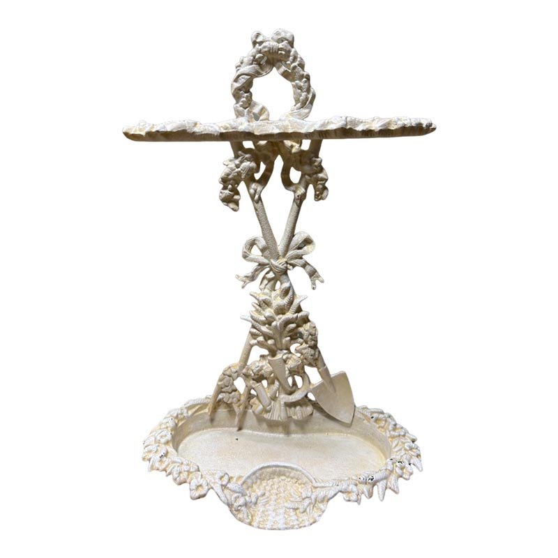 This cast iron umbrella stand is designed with attention to detail and durability in mind. The stand boasts a lovely painted finish that complements its shabby chic style. Decorated with elegant ribbons, it exudes a sense of timeless charm. Additionally, the stand features two spades at the base, adding an extra touch of uniqueness and stability.