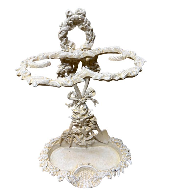 Incorporating a large pretty painted shabby chic cast iron umbrella stand into your home is a fantastic way to blend functionality with style. Its decorative ribbons and unique spades at the base make it a standout piece that enhances any entryway. Don’t miss out on the opportunity to elevate your home’s decor with this stunning and practical addition.