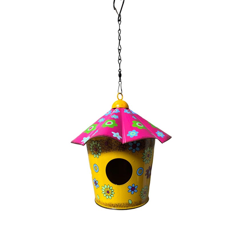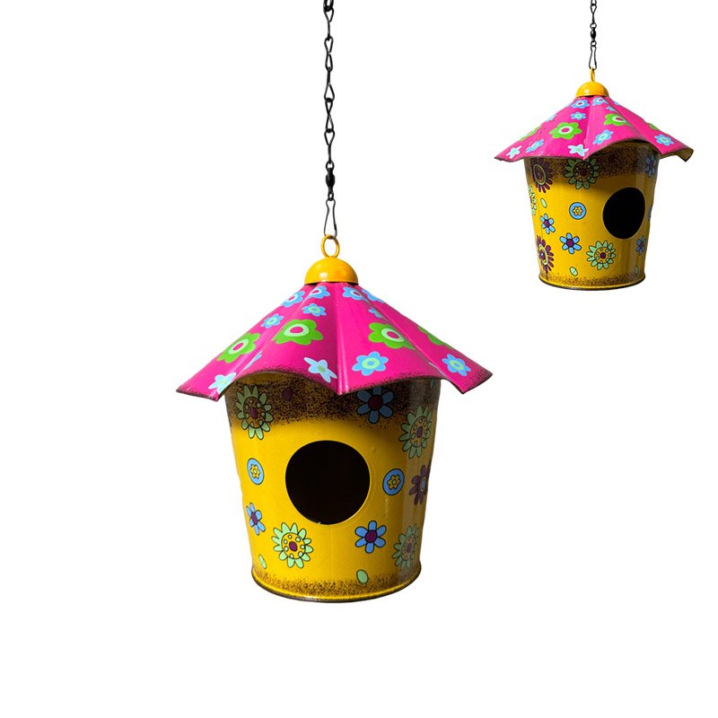 Red and Yellow Metal Birdhouse with Flowers Wild Bird House Garden decoration